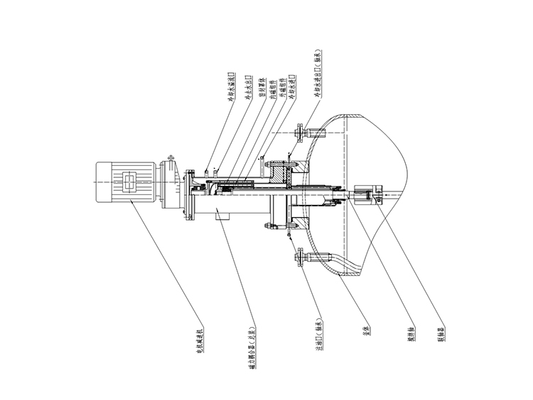 用稀土永磁制作的強磁回轉式耦合結構(磁力驅動裝置),磁力驅動裝置的基本制造材料均為鐵磁性物質,磁導率極佳,磁場在穿過用于密封合金層時幾乎沒有損耗。由此外部驅動永磁體產生的旋轉磁場可以有效被內部永磁體轉子接受,進而帶動反應器內的攪拌部件進行物料混合,攪拌速度為0~300r/min,甚至更高,可配推進、槳式、錨式、框式、螺帶等各種槳。