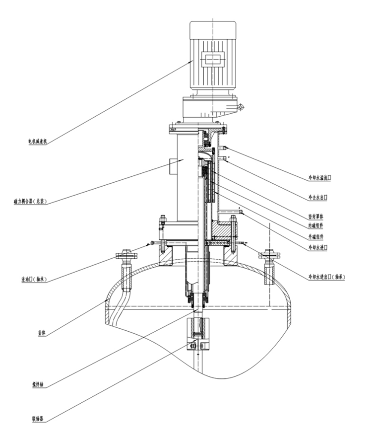 用稀土永磁制作的強磁回轉式耦合結構(磁力驅動裝置),磁力驅動裝置的基本制造材料均為鐵磁性物質,磁導率極佳,磁場在穿過用于密封合金層時幾乎沒有損耗。由此外部驅動永磁體產(chǎn)生的旋轉磁場可以有效被內部永磁體轉子接受,進而帶動反應器內的攪拌部件進行物料混合,攪拌速度為0~300r/min,甚至更高,可配推進、槳式、錨式、框式、螺帶等各種槳。